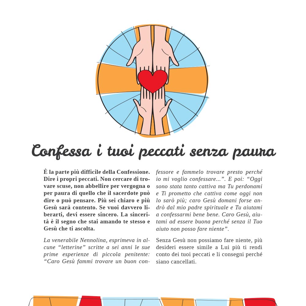 la Confessione è un momento molto importante della tua vita, da vivere con cura e attenzione. Il buon Dio ti aspetta per fare festa con te, la festa del perdono. Dio non è un Padre minaccioso e sempre arrabbiato, al contrario è amorevole e tanto paziente.