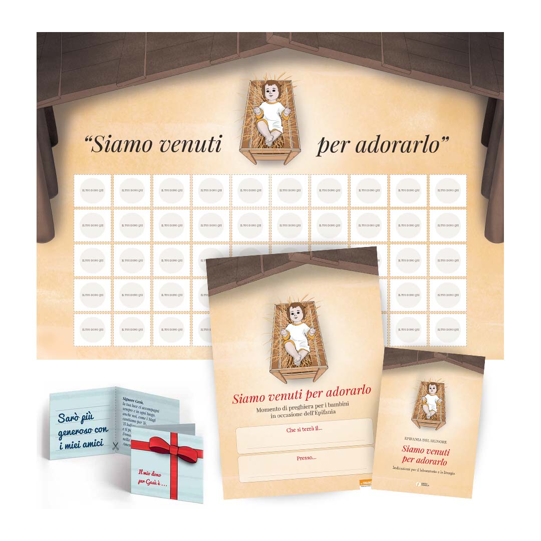 Pacchetto che contiene il kit “Siamo venuti per adorarlo”: 100 pieghevoli + 2 cartelloni + 1 locandina + 1 opuscolo per la liturgia + cartoncini oro, incenso e mirra + nastro biadesivo